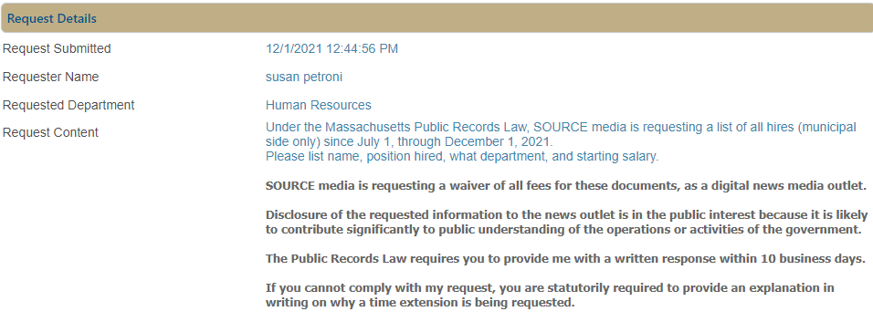 Attached please find the responsive documents for your request. As per previously established practice under the direction of legal counsel and the Secretary of the Commonwealth’s Division of Public Records office, the home contact, health and medical, and / or family information, as well as other details of a sufficiently personal nature, etc. have been redacted under the following exemption(s): Exemption (c) personnel and medical files or information; also any other materials or data relating to a specifically named individual, the disclosure of which may constitute an unwarranted invasion of personal privacy G. L. c. 4, § 7(26)(c). Exemption (o) the home address, personal email address and home telephone number of an employee of the judicial branch, an unelected employee of the general court, an agency, executive office, department, board, commission, bureau, division or authority of the commonwealth, or of a political subdivision thereof or of an authority established by the general court to serve a public purpose, in the custody of a government agency which maintains records identifying persons as falling within those categories G. L. c. 4, § 7 (26)(o). Exemption (p) the name, home address, personal email address and home telephone number of a family member of a commonwealth employee, contained in a record in the custody of a government agency which maintains records identifying persons as falling within the categories listed in subclause (o) G. L. c. 4, § 7 (26)(p).